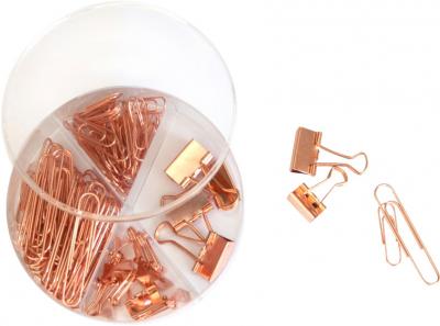 Ø 10 x 2,6 cm. Plástico. Set de clip y sujeta papeles color cobre en estuche con 4 divisiones. 5 sujetas papeles de 1,9 cm. 8 sujetas papeles 1,5 cm. 30 clip 5 cm. 70 clip 2,8 cm. Estuche contenedor con cuatro divisiones.